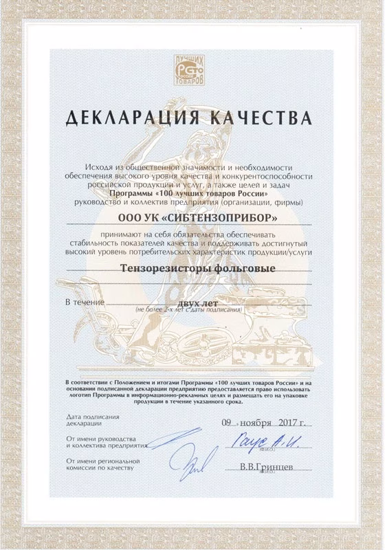 По результатам заседания конкурсной комиссии ООО УК «СИБТЕНЗОПРИБОР» стало лауреатом и дипломатом на федеральном этапе Всероссийского конкурса «100 лучших товаров России» и теперь имеет право маркировать продукцию золотым логотипом «100 лучших товаров России».